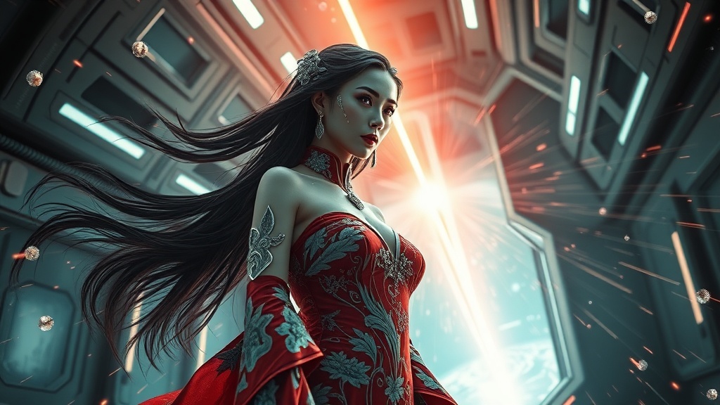 A cyber-enhanced woman with intricate cyberpunk prosthetics, adorned in an elegant Chinese gown, her long hair flowing with the movement of a futuristic spaceship's interior. The scene is set in a sci-fi universe, exuding hyper-realistic and photorealistic detail. A radiant laser beam originates from the center, connecting to an intense laser descending from the sky, surrounded by swirling energy clots. The atmosphere is charged with acceleration and dynamic light flashes, embodying speed. The visual is rendered in a painterly style with cinematic overtones, utilizing long exposure techniques and capturing in 8K super-resolution for an HD masterpiece.