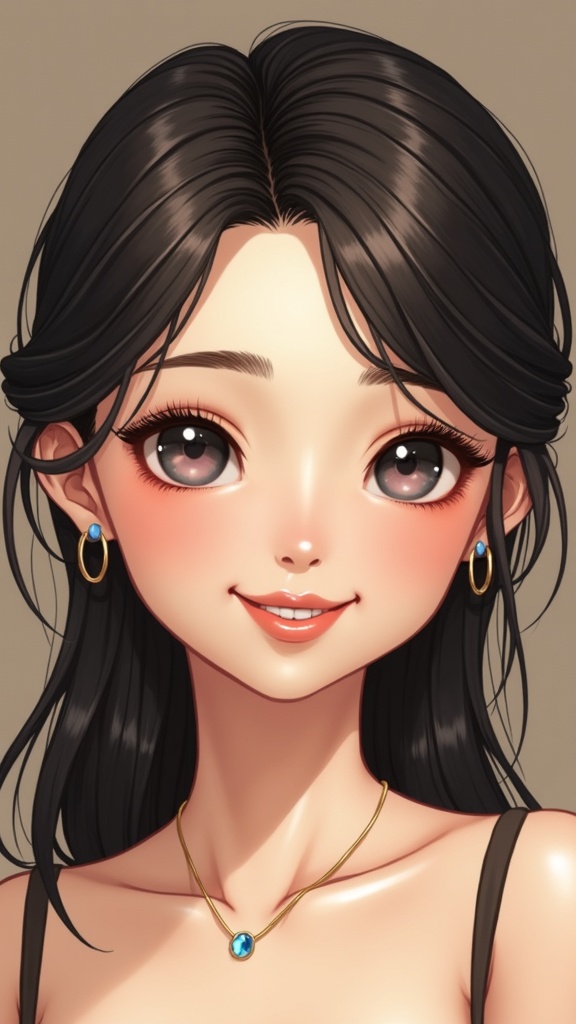 View this AI-generated image featuring 1 woman detailed beautiful face black hair radiant white shiny skin smiling illustration 3d effect sepia tone painting style cartoonish sketch low resolution imperfect anatomy imperfect hands normal quality unique characteristics subtle eyeshadow distinct eyebr