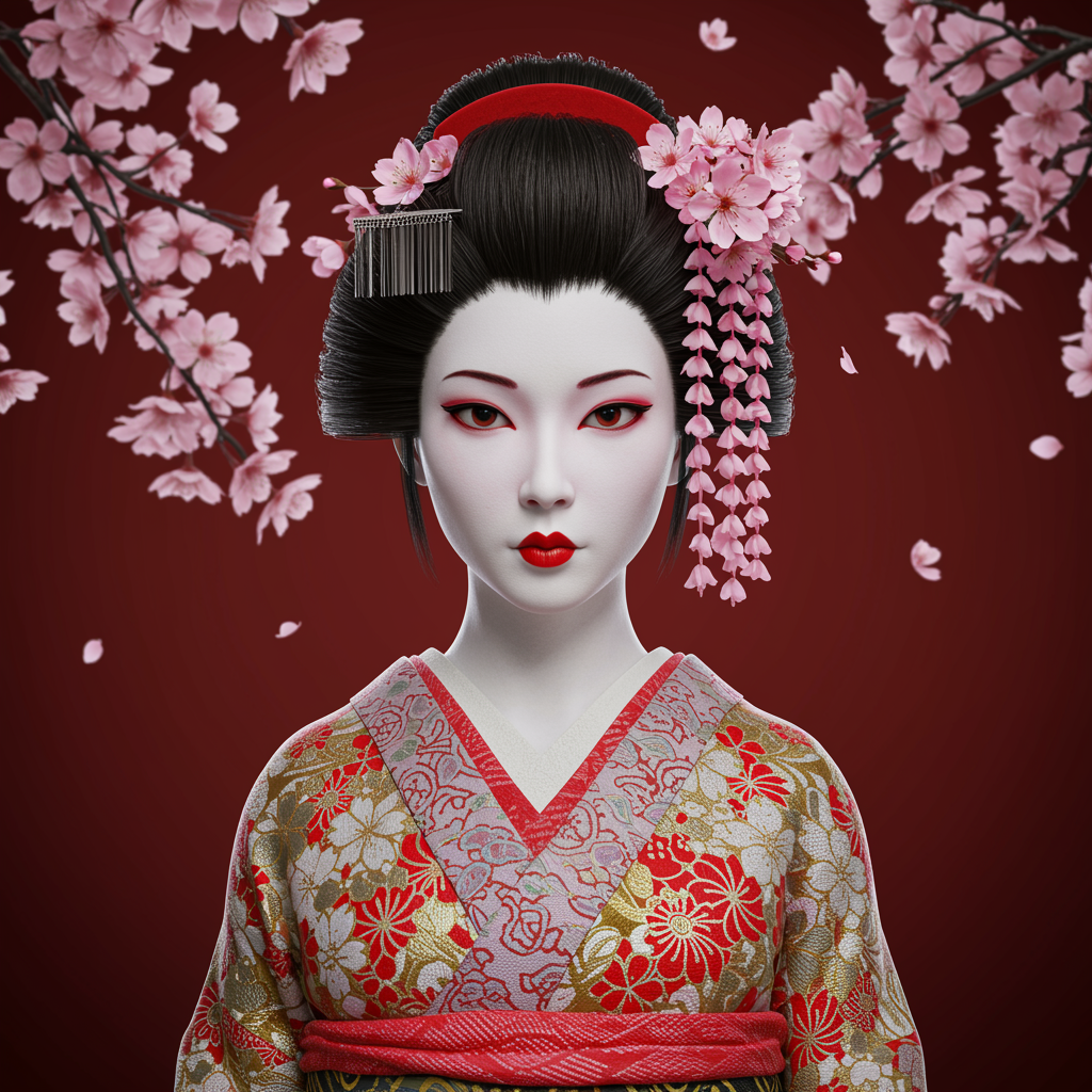 A Japanese woman dressed in a traditional kimono, her hair elegantly styled with delicate cherry blossoms woven throughout. Her porcelain-like complexion contrasts beautifully with her striking red lips and eyes lined with sharp black strokes that convey an aura of mystery and allure. Rendered in 3D CGI, this figure embodies a doll-like quality with a whimsical touch. The intricate details of her attire and the cherry blossoms are meticulously crafted, bringing a sense of timeless beauty and cultural richness. Her serene expression and poised posture contribute to an overall sense of grace and harmony.