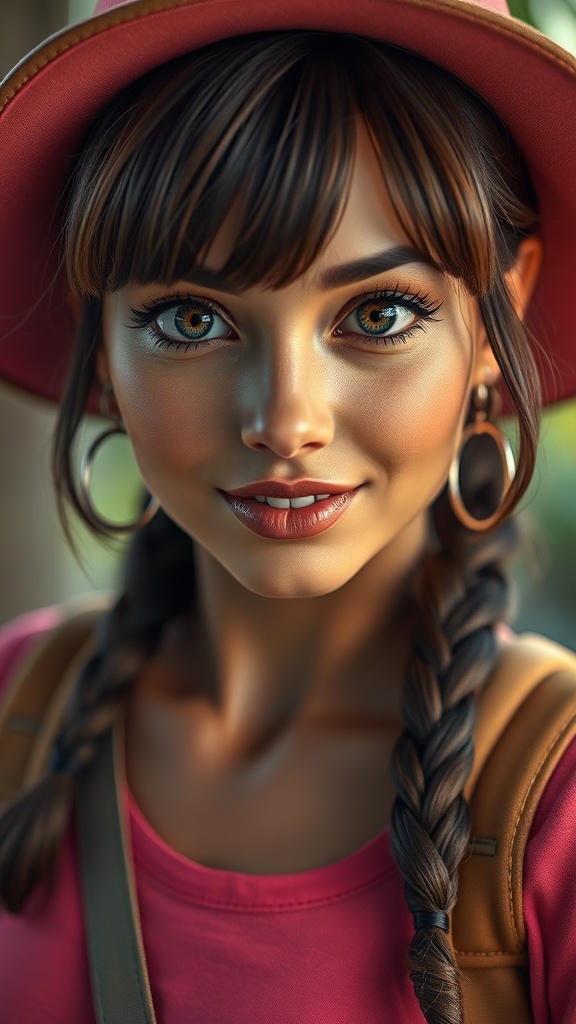 View this AI-generated image featuring a stunning woman dressed as dora the explorer exuding charm and confidence engaging with the viewer through an alluring gaze her detailed skin is captured with photo realistic precision set in an 8k highly detailed full length photograph emphasizing hyperrealis