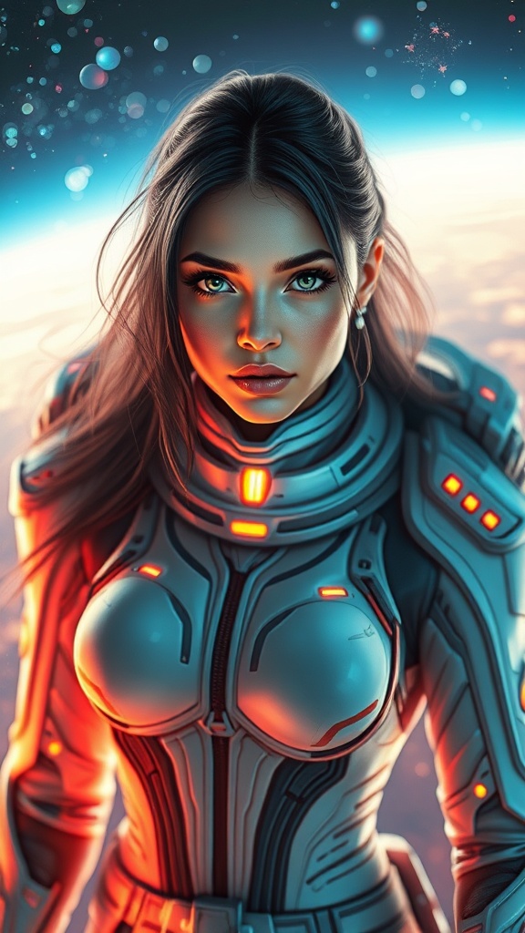 Woman in character portrait, space art, high-detailed official artwork, fantastic screenshot art, hyperrealism, dynamic lighting, showcasing captivating expression, futuristic attire, ethereal background, vibrant color palette, utilizing innovative techniques to achieve immersive realism, intricate details in facial features and textures, seamless composition, luminous elements enhancing the atmosphere, no visual flaws or distortions, maintaining anatomical accuracy, refined hands and feet, balanced proportions, captivating and elegant representation.