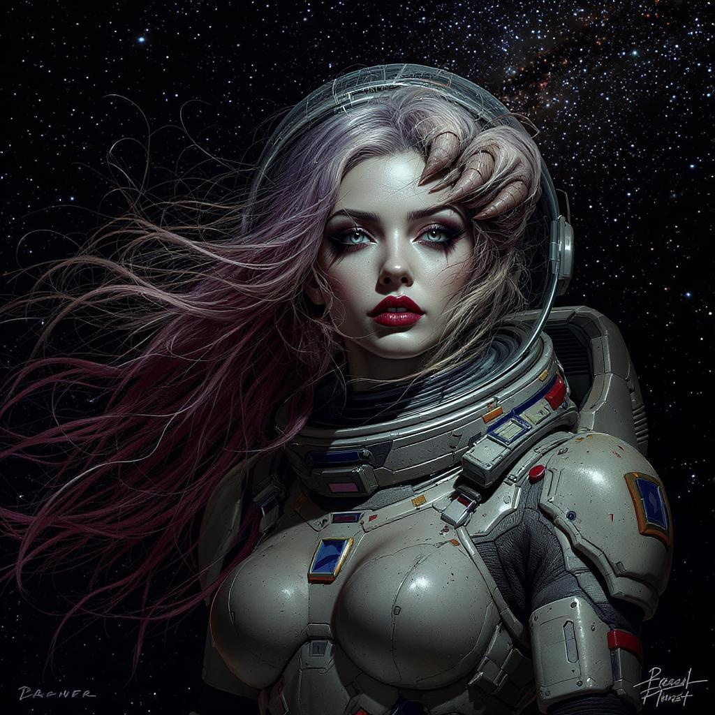 Woman in a space suit, characterized by a captivating portrait inspired by space art, clad in retro-futuristic armor. The artwork is highly detailed, portraying an official piece with hyperrealistic features. Her hair flows like the Milky Way, creating a sense of cosmic wonder. The dynamic lighting captures a fantastic screenshot-like quality. Despite the low resolution and presence of text, the portrait maintains an aura of mystique. Minor imperfections are visible around fingers and digits, alongside hints of cropped and blurred sections, which add a unique texture. The art style features aspects like jpeg artifacts and fragmented anatomy, adding to the distinctive aesthetic. Extra limbs and unusual formations present an intriguing disfigurement that challenges conventional beauty. The piece conveys a dramatic, otherworldly narrative despite its imperfections and occasional watermarks.