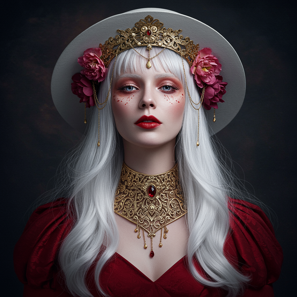 A stunning woman with ethereal white hair wears a striking red dress and a white hat adorned with intricate gold details that accentuate her exquisite features. Her face embodies a blend of styles reminiscent of Gaston Bussiere, Rutkowski, and Mucha, with a hint of Tim Burton’s mystique and Michael Whelan’s fantastical elements. This goddess-like figure stands out in a high-fashion, hyper-realistic portrait, her elegance akin to the creations of Greg Hildebrandt and Ivan Albright. Her crown, crafted from delicate flowers, is intertwined with golden filigree ornaments that gracefully drape around her neckline, evoking a sense of regal beauty. Set against a dark, atmospheric background, the portrait captures the essence of a fashion magazine cover with award-winning lighting that highlights every detail. The cinematic and dramatic lighting creates a rich, atmospheric contrast, enhancing the photorealism and detailed intricacy of this captivating image. Inspired by the trends on ArtStation, the result is a breathtaking, 4K digital painting that combines oil paint textures with digital precision, avoiding any disfigured or unrealistic elements.