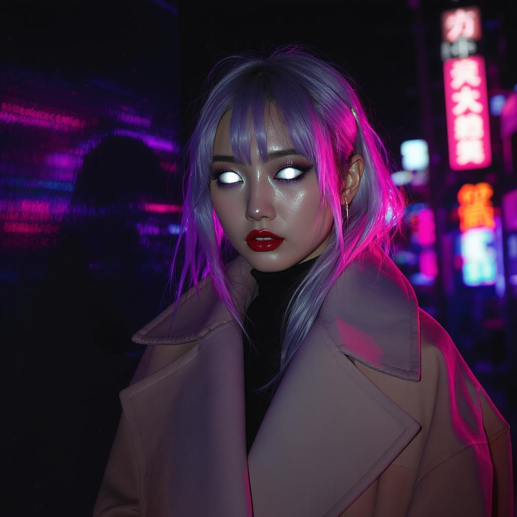 View this AI-generated image featuring a japanese woman with striking white contact lenses and bold dramatic eyeshadow clad in an oversized coat under a black light her hair is a striking shade of silver illuminated by the vibrant glow of neon lights reflecting around her the scene is captured in hy