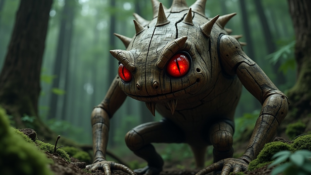 A menacing wooden creature with an intense crimson eye, blending the surreal style of Filip Hodas and realistic rendering of Daz3D, set within a mysterious jungle reminiscent of Sandy Skoglund's and Natalia Rak's work. This hyper-detailed illustration captures a large red-eyed monster lurking in a dense pine forest, rendered in Maya with organic, nature-inspired forms. It features a close-up view, intertwining elements of frogcore aesthetics with a storybook charm, showcasing intricate textures and patterns in its wooden form, conveying an anthropological aura within its eerie forest domain.