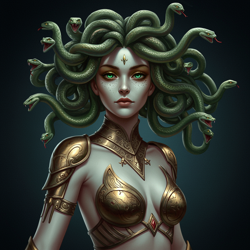 View this AI-generated image featuring young medusa full body hair flowing with countless serpents mesmerizing emerald eyes feminine visage adorned in ornate metal attire trending on artstation crisp clarity studio lighting intricately detailed expressive gaze digital illustration finely polished ra
