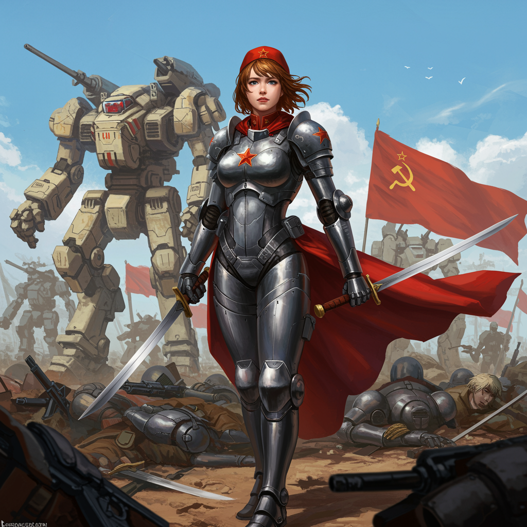 View this AI-generated image featuring a stunning young woman clad in sleek futuristic warrior armor embodying the strength and grace of a soviet heroine stands confidently amidst a backdrop of towering mechs and a chaotic battleground of guns and swords set against a clear sunny sky the scene captu