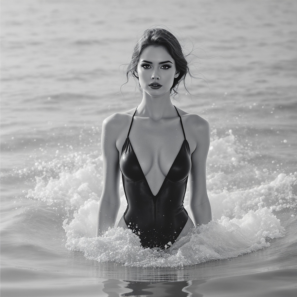 A graceful young woman in a sleek swimsuit emerges from the water, captured in a mesmerizing black and white photograph. Her presence is both elegant and inspiring, with complex details and a sharp focus that highlight her serene expression. The composition is masterful and cinematic, blending modern and classic fine art elements. Volumetric lighting enhances the scene, creating an ethereal atmosphere that is truly breathtaking.
