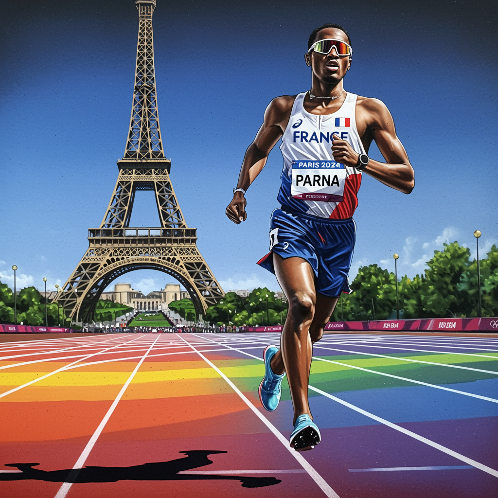 A vivid airbrushed artwork features an Olympic runner, inspired by Greg Rutkowski's style, dressed in vibrant gear with the Eiffel Tower towering majestically behind him. The runner is caught mid-stride on a radiant, rainbow-striped track, embodying movement and speed. He wears sleek sunglasses and proudly dons France's Olympic apparel, with "Paris 2024" elegantly inscribed down one sleeve. The scene is bathed in dynamic colors, celebrating both the athlete's determination and the iconic Parisian locale.