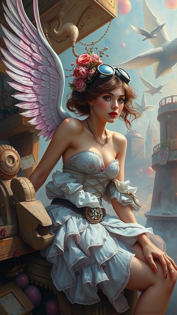 Airy, pin-up, sci-fi, steampunk, highly detailed and realistic, influenced by figurative painting, fine art, oil painting on canvas, captivating artwork inspired by Daniel F Gerhartz, emphasizing ethereal beauty and a vivid dream-like quality, enhanced with imaginative and surreal elements.