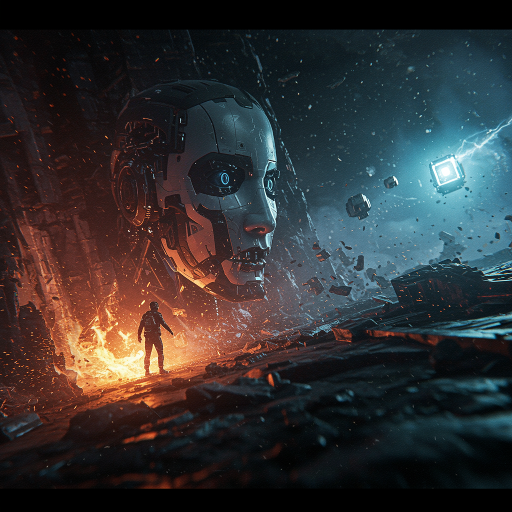 AI's true threat lies not in destruction, but in unraveling our sanity, trending on artstation, showcasing intricate matte painting, dynamic animation lighting, profound depth of field, and ultra detailed precision, aspect ratio 16:16, with high quality and sophistication, striking a balance between chaos and artistry.