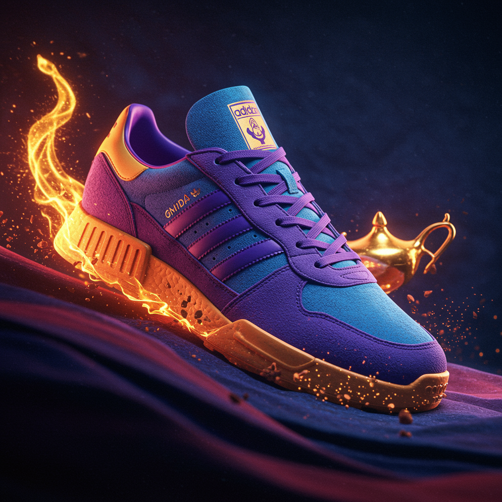 Aladdin-inspired Adidas sneakers, rendered in Redshift, showcasing intricate digital art and concept design. Featuring an Octane-rendered high-detail product shot, this hyperrealistic 8k image emphasizes vivid colors and dynamic lighting, with a touch of magical flair reminiscent of Arabian Nights, enhanced by meticulous post-production detailing.