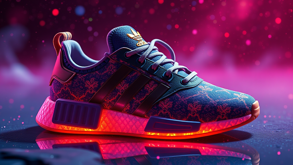 Aladdin-inspired Adidas sneakers, rendered in a cosmic redshift style, digital art meets concept design, showcasing intricate details, Octane-rendered product shot in stunning 8k resolution, hyperrealistic visualization with vibrant colors and enchanting patterns, post-production enhancements emphasize the magical essence and allure, capturing the spirit of adventure and whimsy reminiscent of an animated fantasy world.