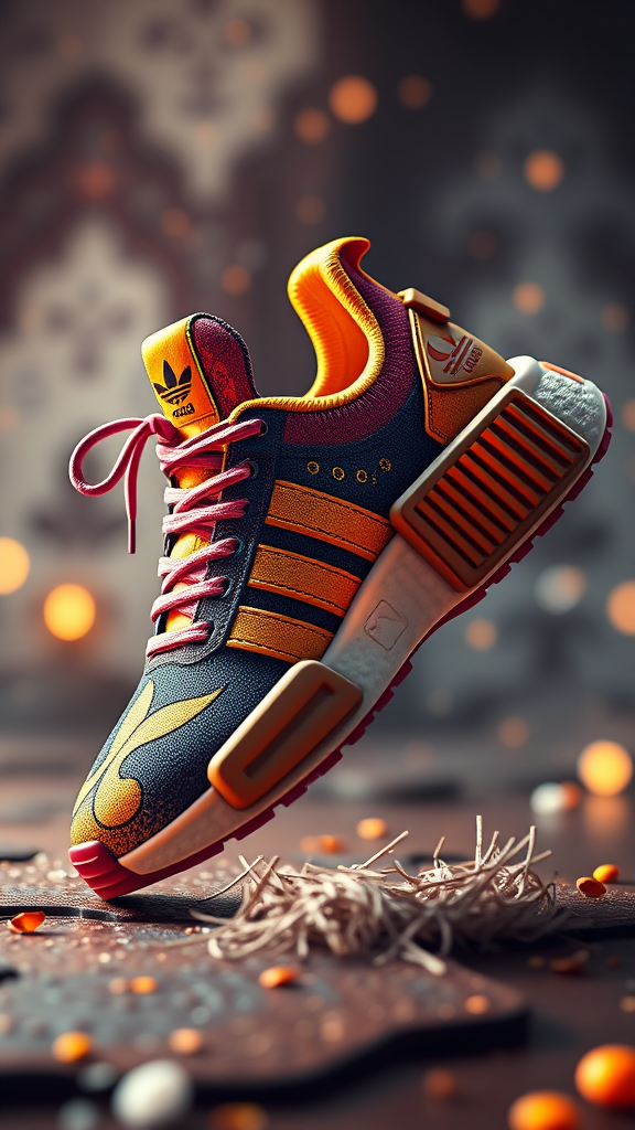 Aladdin-themed Adidas sneakers, blending elements from the classic Disney tale with a modern twist; rendered in digital art with high detail and hyperrealistic features. Utilizing redshift and octane render techniques for a vibrant, cinematic product shot in 8k resolution. The sneakers feature intricate design details inspired by Aladdin's world, with rich textures and dynamic lighting enhancing their appeal. Post-production adds a layer of magic and authenticity, creating a captivating visual experience that highlights the fusion of storytelling and contemporary sneaker culture.
