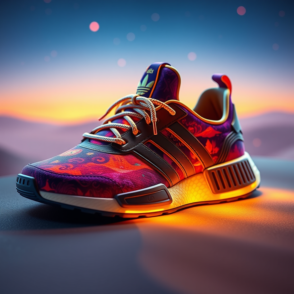 Aladdin-themed adidas sneakers, inspired by Disney's magic and adventure, vividly captured in a redshift render. This digital concept art showcases a hyperrealistic product shot with 8K resolution, highlighting intricate details and vibrant colors. The sneakers are designed with enchanting motifs, reminiscent of a mystical desert landscape, brought to life with high-detail textures and sophisticated post-production enhancements for an immersive visual experience.