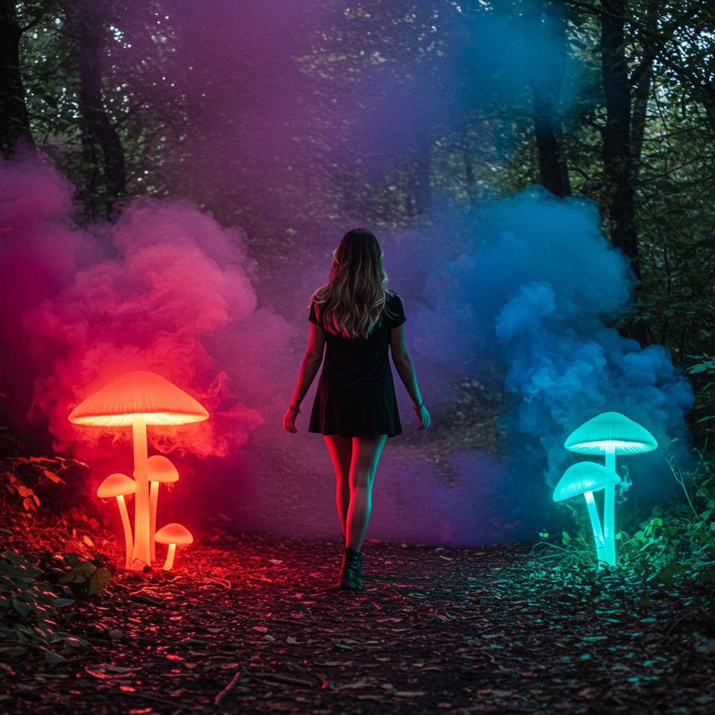 Alayna Lemmer, a figure of fantasy, finds herself amidst a forest pulsating with energy, where vibrant, glowing mushrooms illuminate the path. Enveloped in an aura of wonder, she navigates through multicolored smoke that dances through the air in whimsical patterns. Each step she takes is accompanied by a symphony of colors and light, painting an imaginative tapestry where creativity knows no bounds.