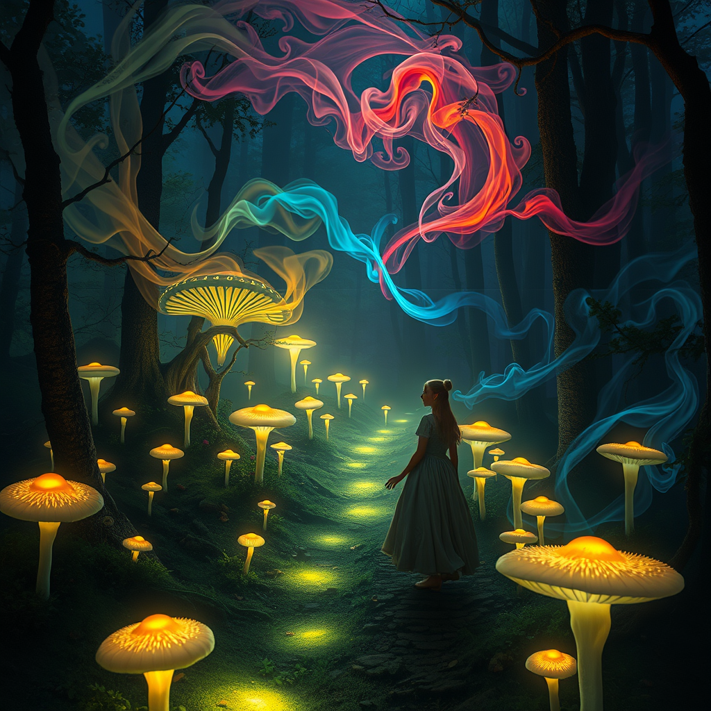 Alayna Lemmer in a fantastical realm where glowing mushrooms light the forest paths, their luminescence casting a soft, mystical glow. Wisps of multicolored smoke weave through the trees, forming intricate patterns in the air, embodying a unique and inventive spirit. The forest pulses with an otherworldly energy, each step bringing forth new wonders in a symphony of colors and light. Alayna, attuned to this magical symphony, embarks on a journey filled with enchanting discoveries and hidden secrets.