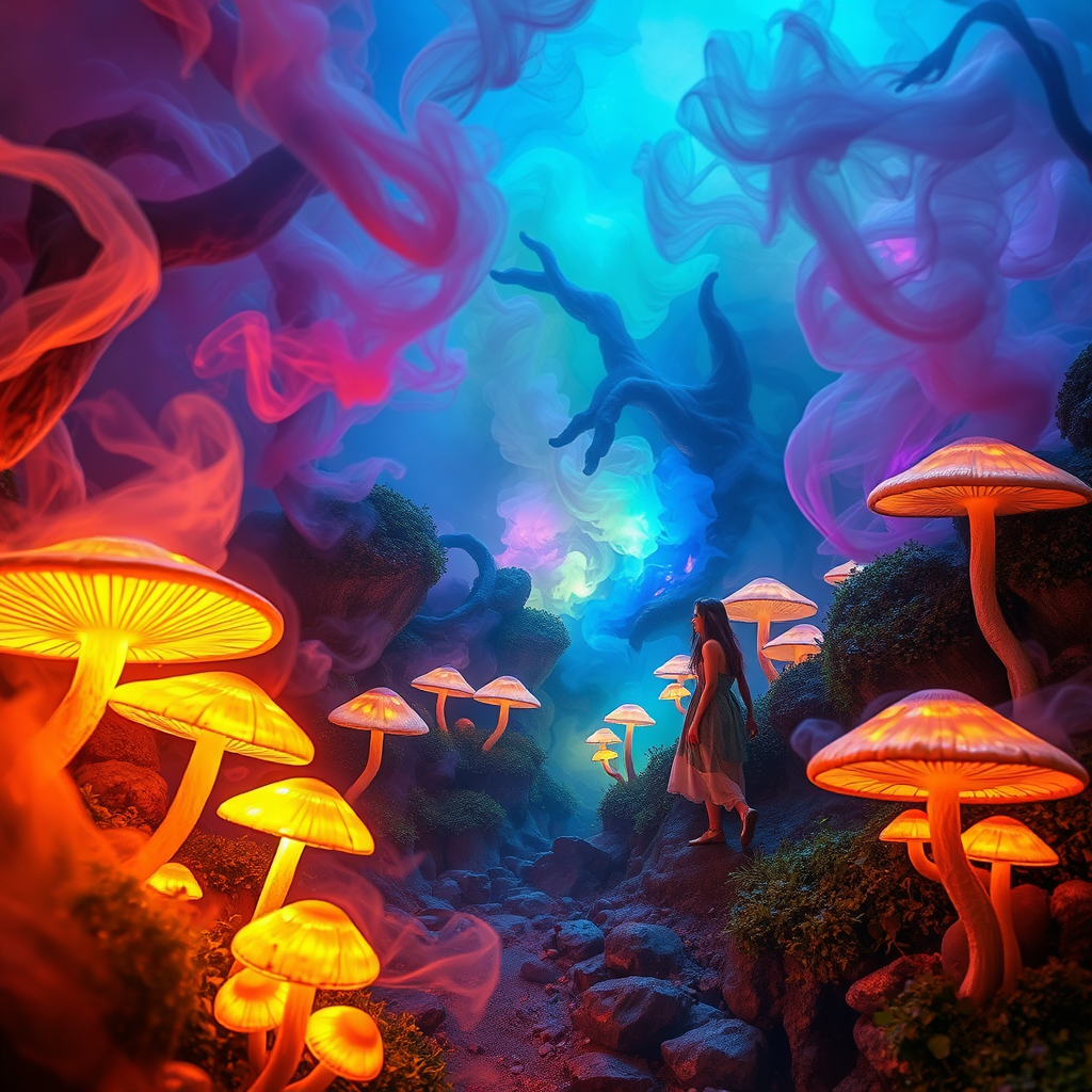 Alayna Lemmer wanders through an enchanting fantasy realm where luminescent mushrooms cast a mystical glow. She finds herself amidst vibrant, multicolored smoke swirling in intricate patterns, painting the air with hues that dance like whispered secrets. This fantastical landscape is unique, brimming with creativity and inventive wonders, capturing the essence of magic in every detail.