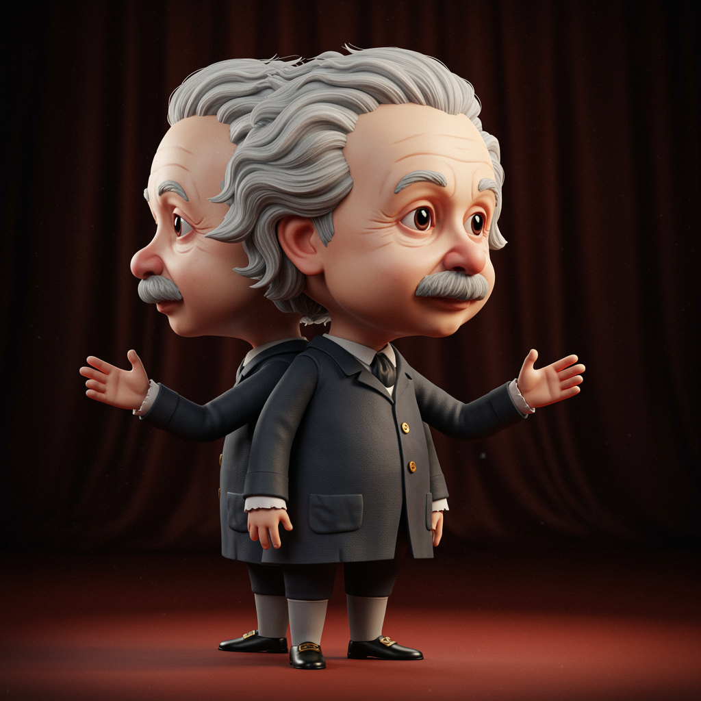 Albert Einstein in a whimsical character portrait, captured from a side profile while standing on stage, depicted in a chibi, kawaii style with 3D octane rendering. The scene is enhanced with volumetric light, showcasing Einstein dressed in Victorian fashion with a metallic twist. His face is highly detailed and symmetrically perfect, with sharp, expressive eyes, capturing ultra-high quality reminiscent of art by Anja Millen, George Cruikshank, and Bordalo II. The art maintains a smooth, sharp focus, suitable for trending on platforms like Artforum and Behance HD, designed in a kids' storybook style with muted, watercolor tones. The image is creatively distorted with dual heads and faces, subtly cropped to leave elements intriguingly out of frame. The portrayal is intentionally drafted with surreal artistic elements, like deformed and twisted hands, showcasing signatures of whimsy with elongated necks, extra limbs, and multiple heads, intentionally leveraging a mix of grainy and high-resolution textures for a unique visual experience. Despite the creative distortion, the depiction retains a bizarre charm with exaggerated features like floating or disconnected limbs and a tastefully misshapen physique, resulting in a surreal, eye-catching caricature of Einstein.