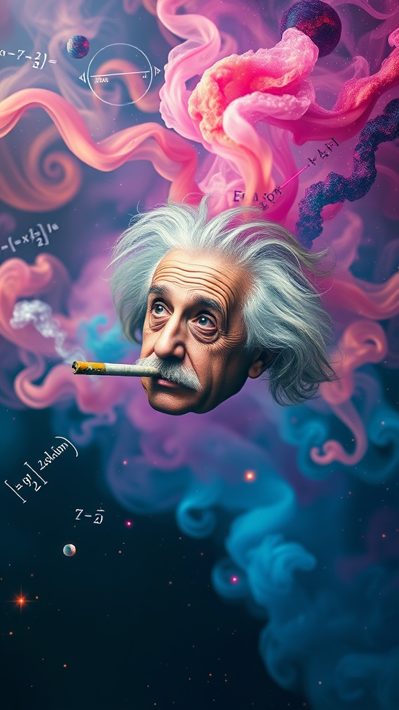 Albert Einstein floats serenely in midair, puffing on a joint as vibrant swirls of volumetric smoke curl around him. Mystical math formulas and equations dance alongside vivid cosmic galaxies, painting a psychedelic tapestry in the air. His hair is wild and eyes twinkle with curiosity, while the scene bursts with photorealistic splendor, merging intellect and imagination in a cosmic ballet.