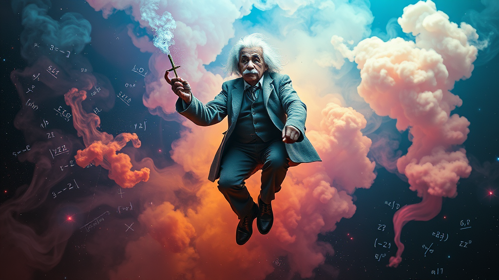 Albert Einstein is suspended in midair, a joint in hand, with a serene expression as he levitates effortlessly. Around him, ethereal plumes of volumetric smoke swirl with vibrant colors. Hallucinations of intricate math formulas and equations intermingle with galaxies and cosmic wonders, creating a mesmerizing tapestry of the universe. The scene exudes a sense of psychedelic realism, blending the genius of Einstein with the boundless wonders of space and mathematics.