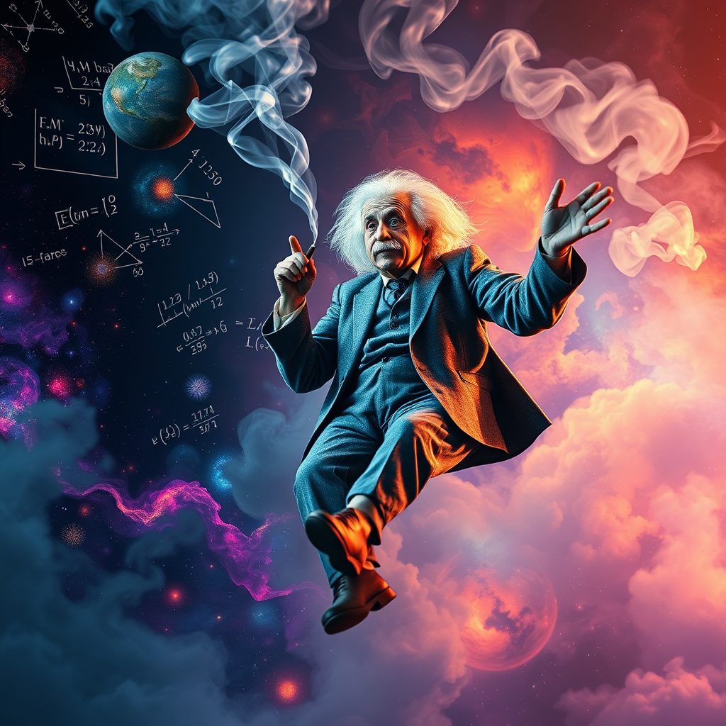 Albert Einstein levitating gracefully in midair, with a serene expression as he inhales from a joint; ethereal, swirling plumes of smoke encircle him. Vivid hallucinations of complex mathematical equations, shimmering galaxies, and vibrant cosmic nebulae drift in the air around him, blending into an awe-inspiring psychedelic panorama. The scene is captured in stunning photorealism, with intricate volumetric smoke enhancing the surreal, dreamlike atmosphere.