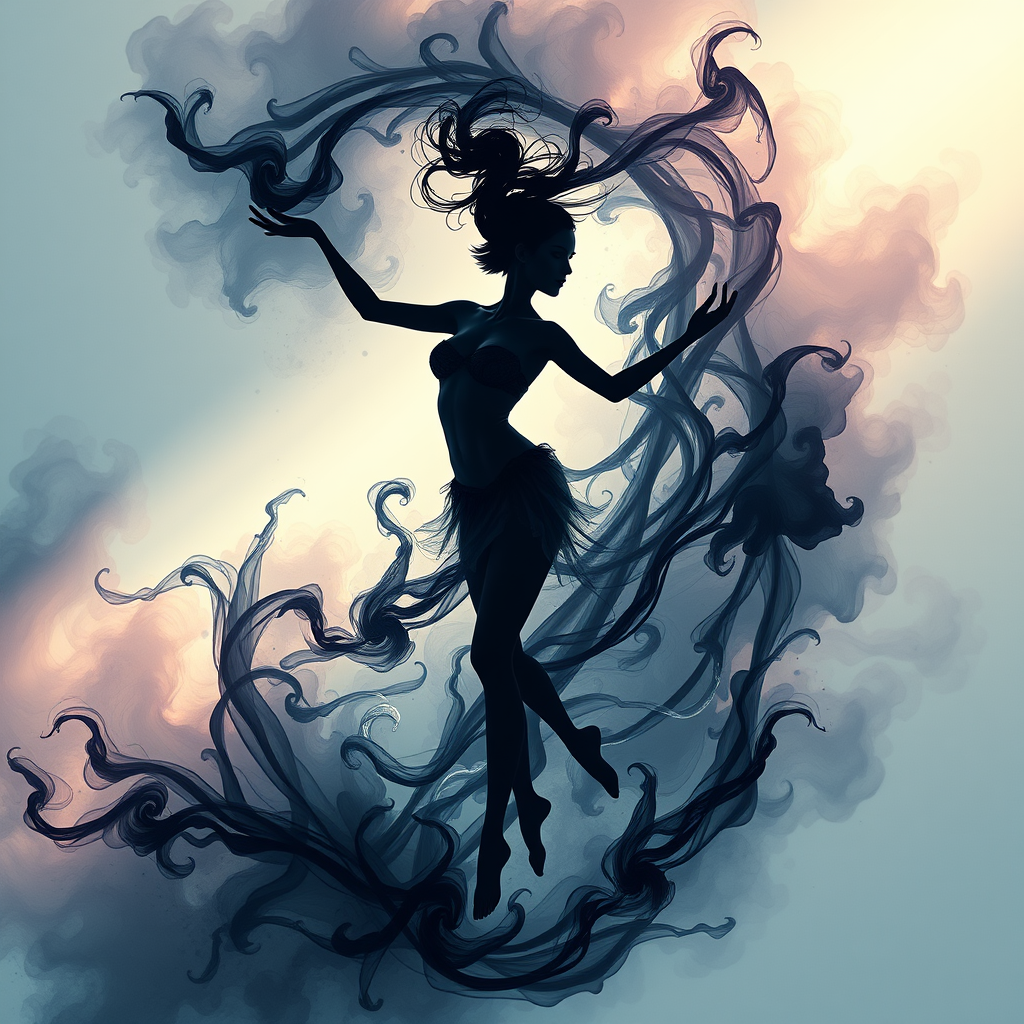 Alberto Seveso-inspired art, a dynamic silhouette of a graceful dancer, water ink, ink water, swirling ink clouds, 3D digital painting, intricate and detailed elements, god rays filtering through, emphasizing a curvaceous form, cinematic lighting, rendered in octane, 8k resolution, with volumetric lighting creating depth, balanced complementary colors, hints of flame-like motions, synthwave influence, highly realistic, exploring surreal elements, unique anatomy, artistic interpretation of forms, conveying movement with a touch of abstraction, ambiguous limb placement fostering intrigue, dreamlike, with an ethereal touch blending beauty and unconventional form.