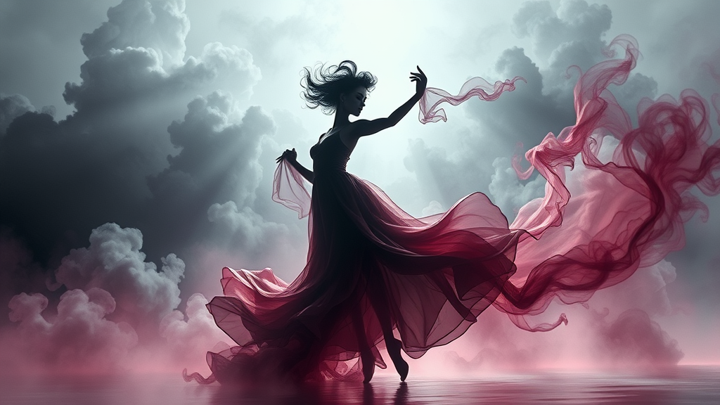 Alberto Seveso-inspired art, ethereal silhouette of a graceful woman dancing, immersed in smoky water ink and swirling ink clouds, 3D Digital Painting with intricate detailing and cinematic lighting. Featuring god rays for dramatic effect, the curvilinear form is rendered in 8k with octane render, showcasing volumetric lighting and complementary colors. Merging elements of flame fire and synthwave aesthetics, the piece achieves a hyper-realistic, photo-realistic style. Despite abstract distortions and unusual anatomy with extra limbs and misplaced features, there's an artistic harmony amid the chaotic form. Elements of b&w contrast and kaleidoscopic colors complement a surreal, intriguing landscape melded into an imaginative, dreamlike sequence.