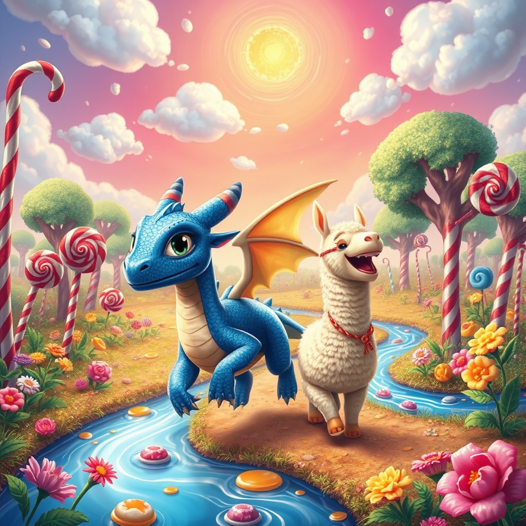 Albi, a friendly blue dragon with shimmering scales, and the lively lemony llama trot joyfully through a whimsical candy land. They are encircled by towering candy cane trees swaying gently in a sweet breeze, while lollipop flowers of every imaginable color line their path. A glistening river of honey meanders through the landscape, its scent rich and inviting. The vibrant sky above is dotted with fluffy cotton candy clouds that drift lazily by. Albi's eyes sparkle with wonder, and the llama's mouth is open in gleeful delight as they explore this enchanting world together. Their adventure is brought to life with radiant colors and enchanting details, capturing the magical essence of their sugary surroundings.