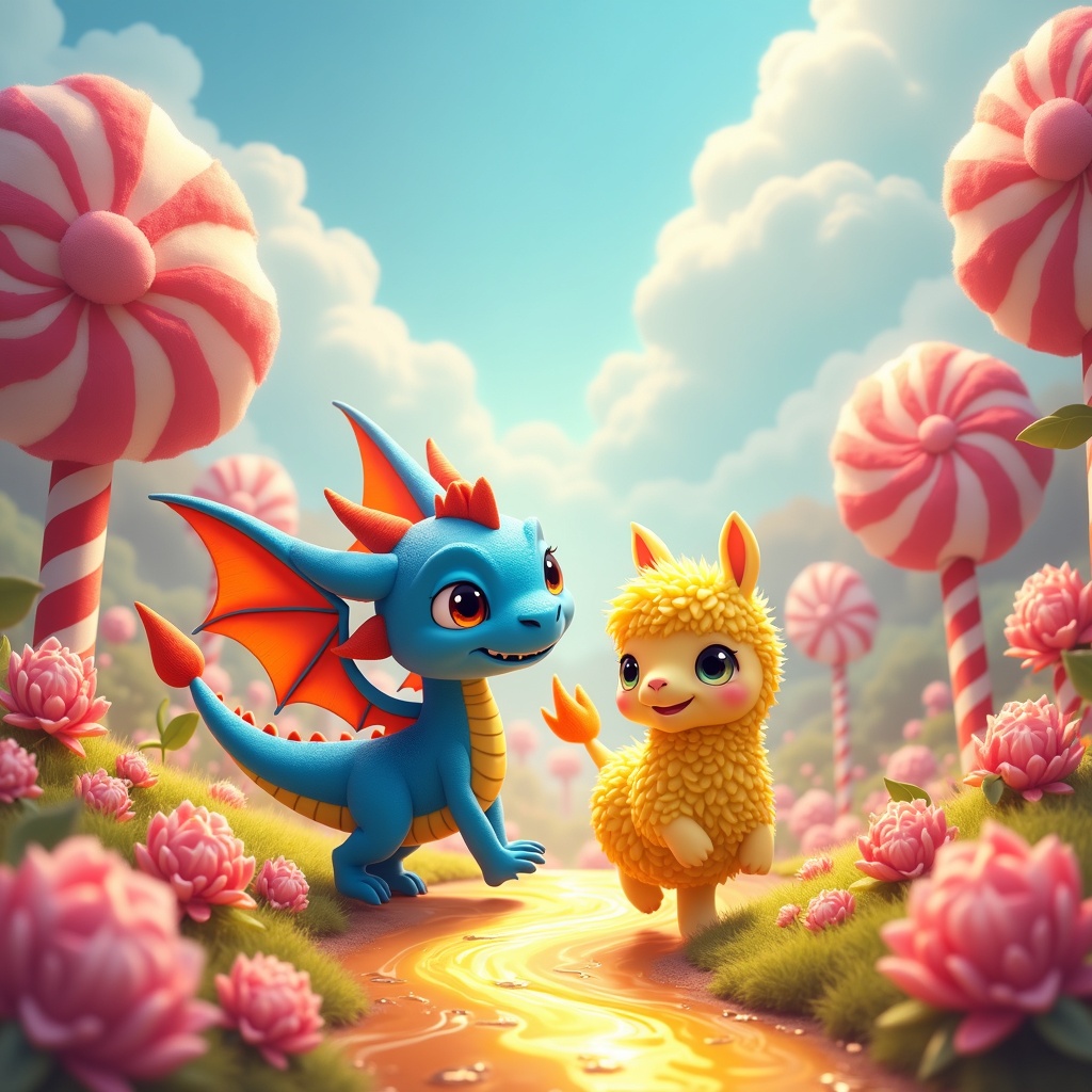Albi, the friendly blue dragon, and his companion, the lemony llama, wander through a fantastical candy land, their eyes wide with wonder. They navigate a landscape where candy cane trees sway gently in a sugary breeze, their red and white stripes gleaming in the sunlight. Enormous lollipop flowers burst with vibrant colors, dotting the ground in a colorful mosaic. A shimmering river of honey meanders through this sweet wonderland, its golden currents sparkling in the light. Albi's wings flutter with excitement, casting a playful shadow over the scene, while the lemony llama trots alongside, its fluffy coat catching rainbow-colored reflections from the surroundings. Towering gumdrop hills rise in the background, completing the whimsical tapestry of this sugary paradise. The delight on Albi's and the llama's faces captures the essence of pure joy and curiosity as they embark on their shared adventure, a testament to the magic of friendship and exploration.