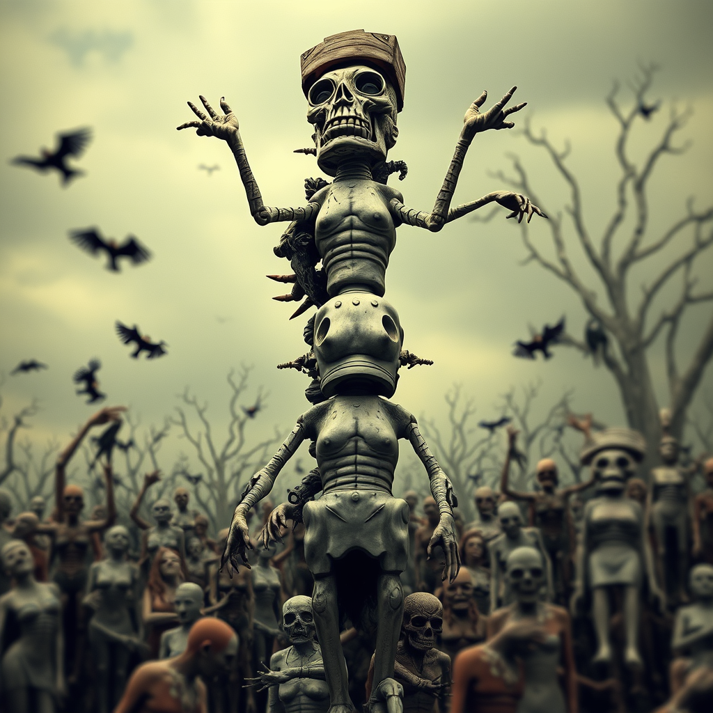 Alice in a twisted Zombieland by Tim Burton, where warped torsos form a grotesque totem pole, featuring anatomically incorrect figures and jumbled limbs. A surreal landscape of misplaced and floating arms, mutated bodies with missing or extra appendages, creates a haunting and blurry tableau. The scene is a chaotic blend of disjointed forms, amputation, and unsettling mutations, capturing an ugly and eerie atmosphere.