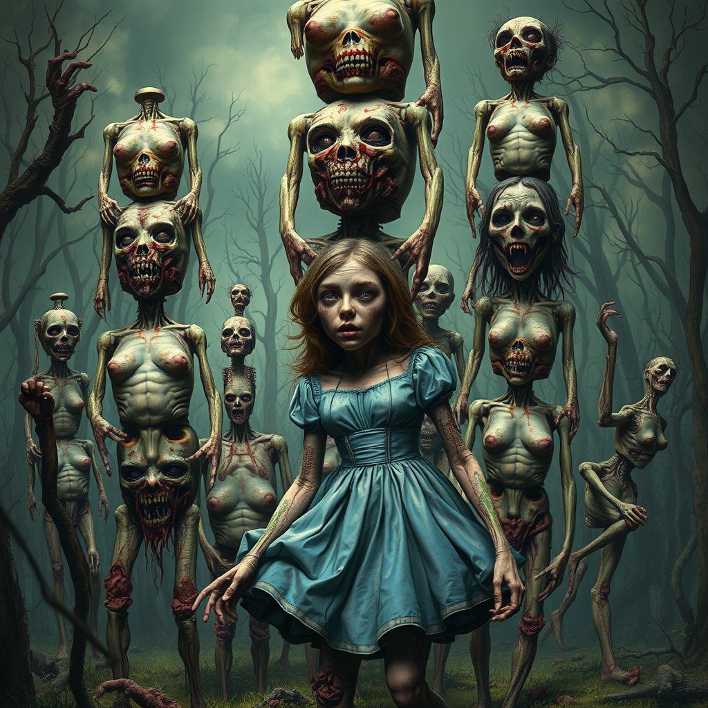 Alice in a twisted Zombieland, envisioned by Tim Burton, where stacked torsos form grotesque totem poles. Limbs awkwardly protrude in bizarre angles, like poorly drawn sketches. Anatomy defies logic, with extra limbs sprouting or crucial ones missing altogether. Limbs float disconnectedly, creating an eerie mutation of forms. Ugly and disgusting, with features blurred as though caught in a nightmarish haze. Amputations reveal raw, unsettling details, contributing to the nightmarish aesthetic, as Alice navigates this surreal, macabre landscape, her reality distorted beyond recognition.