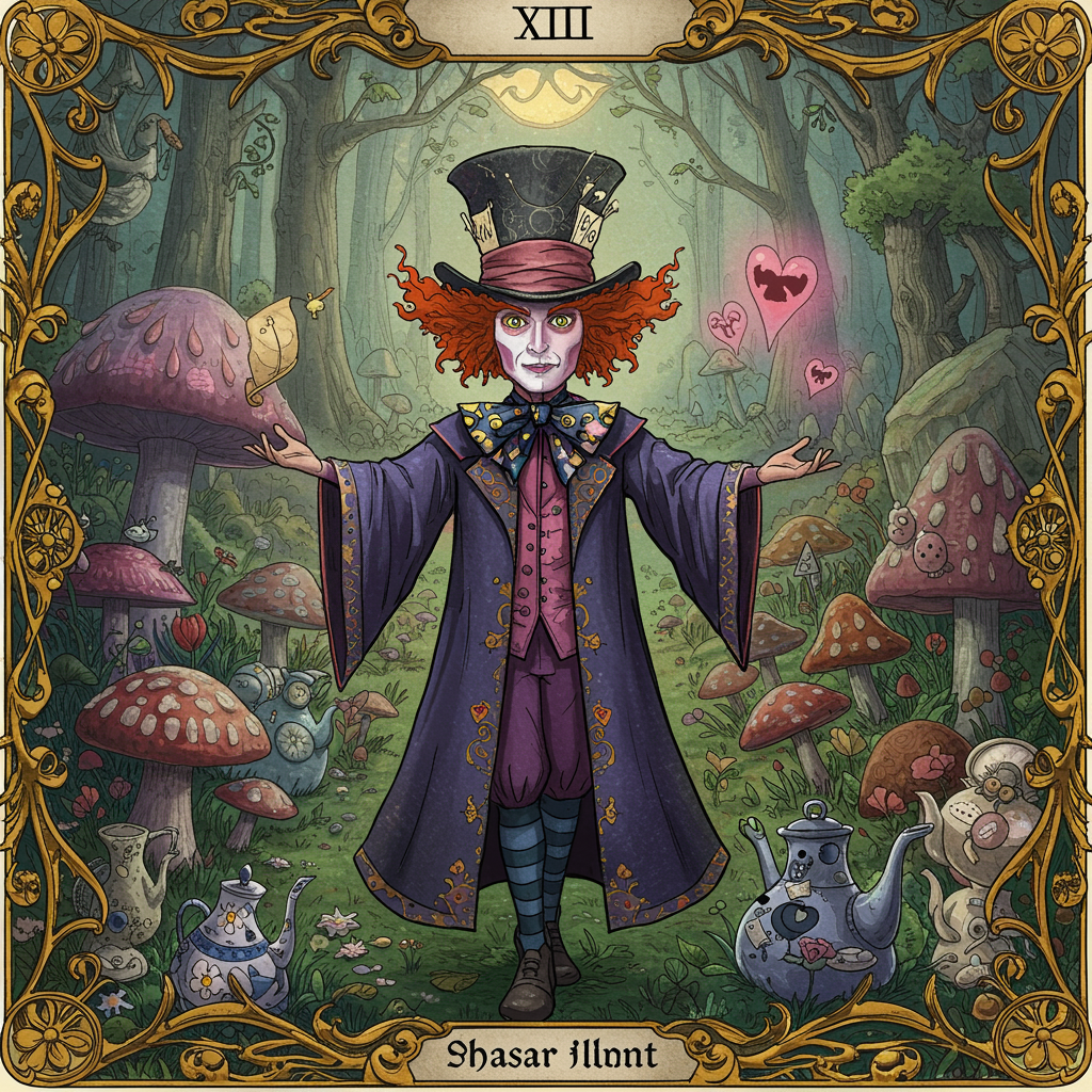 Alice in a whimsical wonderland, a tarot card featuring the Mad Hatter as a mystical magician, with a mesmerizing half skull face; cinematic and hyper-detailed imagery in stunning 8k quality. The scene is richly full of color, inspired by the styles of Stanley Artgerm, Tom Bagshaw, and Carne Griffiths, blending surrealism with intricate elegance, capturing a fantastical essence with vibrant hues and delicate linework.