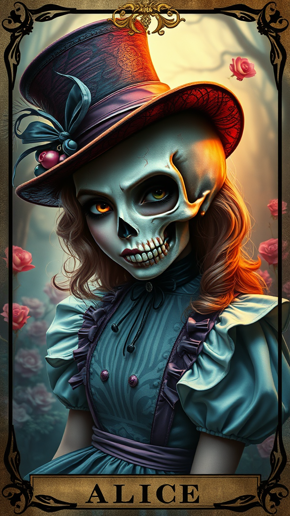 Alice in a whimsical wonderland setting, portrayed as the enigmatic Mad Hatter with a mystical flair, featured on a tarot card with a half skull face design, exuding a cinematic and enchanting aura, rendered in hyper-realistic 8k detail. The artwork is richly colored and intricately detailed, reminiscent of the styles of Stanley Artgerm, Tom Bagshaw, and Carne Griffiths. The portrait captures an ethereal blend of vibrant hues and surreal beauty, merging the fantastical with a touch of the macabre, perfectly embodying a magical and otherworldly essence.