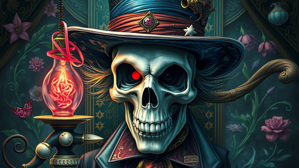 Alice in Wonderland-inspired scene featuring the Mad Hatter as a mystical magician on a tarot card, showcasing a highly detailed, half-skull face. The artwork is cinematic and rendered in 8k resolution, blending styles reminiscent of Stanley Artgerm, Tom Bagshaw, and Carne Griffiths. This image bursts with hyper-detail and vibrant colors, with a touch of surrealism and fantasy, highlighting the whimsical and mysterious essence of the Wonderland universe. The composition emphasizes intricate patterns and enchanting symbolism, inviting viewers into a world of magic and curiosity.