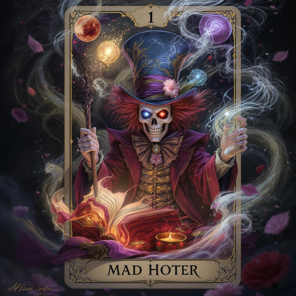 Alice in Wonderland inspired scene featuring the Mad Hatter as a mystical magician on a tarot card, showcasing a highly detailed and vibrant design with a half skull face. The composition is cinematic and rendered in 8k quality, capturing the essence of signature styles by Stanley Artgerm, Tom Bagshaw, and Carne Griffiths. The artwork is hyper-detailed and bursting with color, presenting a surreal and enchanting atmosphere that balances whimsy with an eerie undertone.