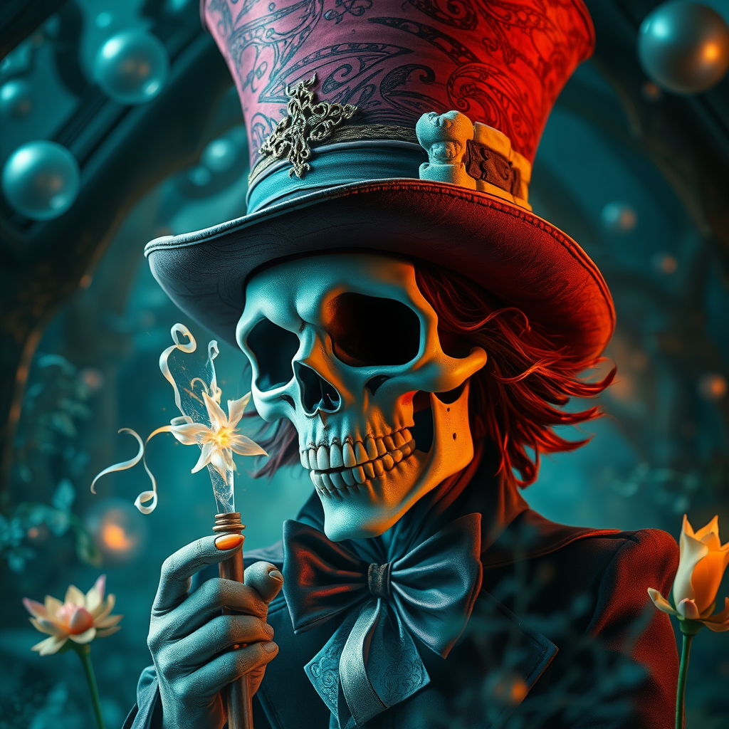 Alice in Wonderland scene with the Mad Hatter as a mystical magician tarot card, featuring a highly detailed half skull face, cinematic atmosphere, in 8K resolution. Artistic style inspired by Stanley Artgerm, Tom Bagshaw, and Carne Griffiths, showcasing hyper-detailed elements and an explosion of color, with a slightly surreal twist, evoking a sense of whimsy and mystery.