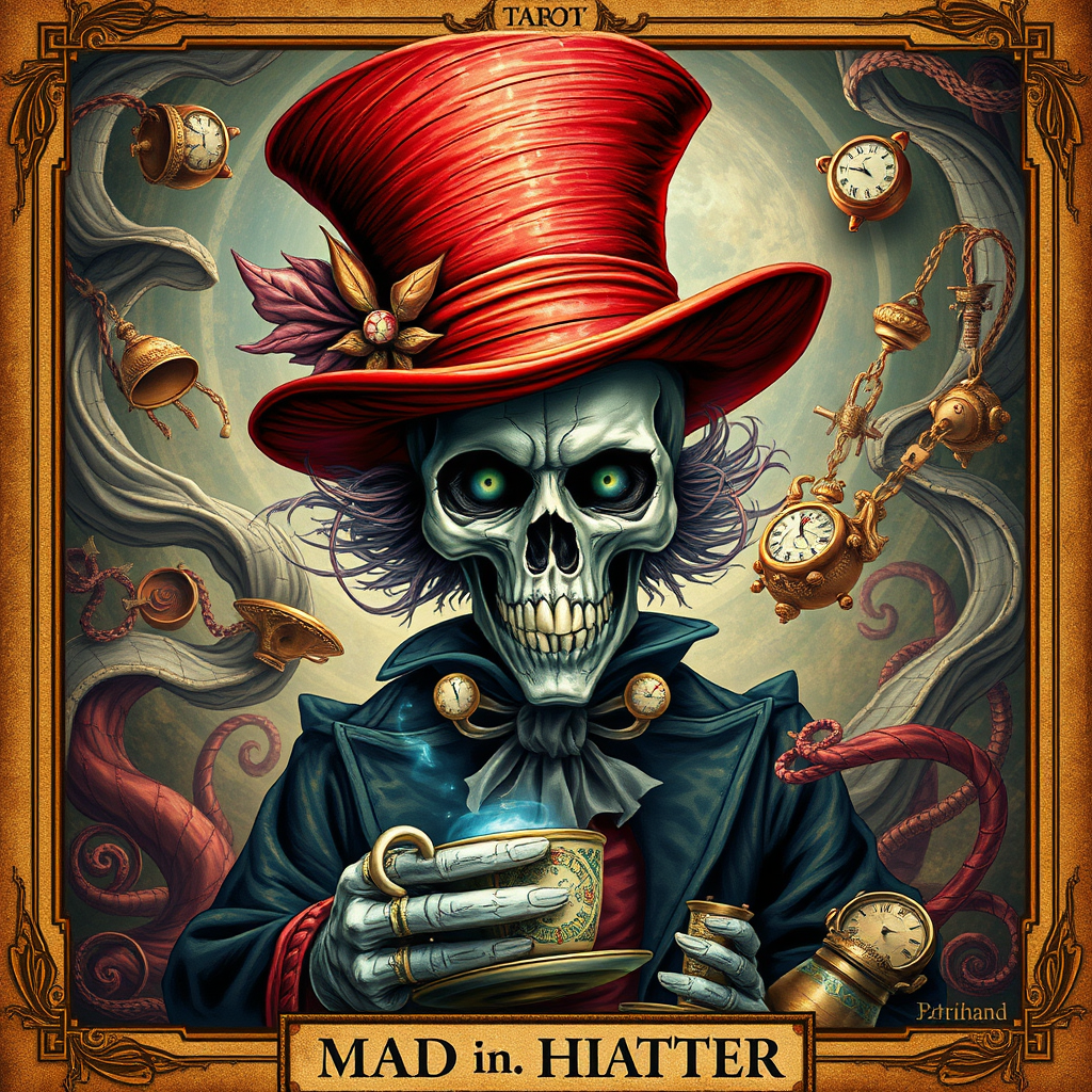 Alice in Wonderland thematic scene featuring the Mad Hatter as an enchanting magician embodied in a tarot card, showcasing a highly detailed half skull face, rendered in a cinematic and vivid 8k resolution. The artwork blends the styles of Stanley Artgerm, Tom Bagshaw, and Carne Griffiths, resulting in a hyper-detailed portrayal brimming with vibrant colors and imaginative nuances. The Mad Hatter stands amidst swirling teacups and timepieces, casting a mystical aura that captures the essence of whimsical fantasy.