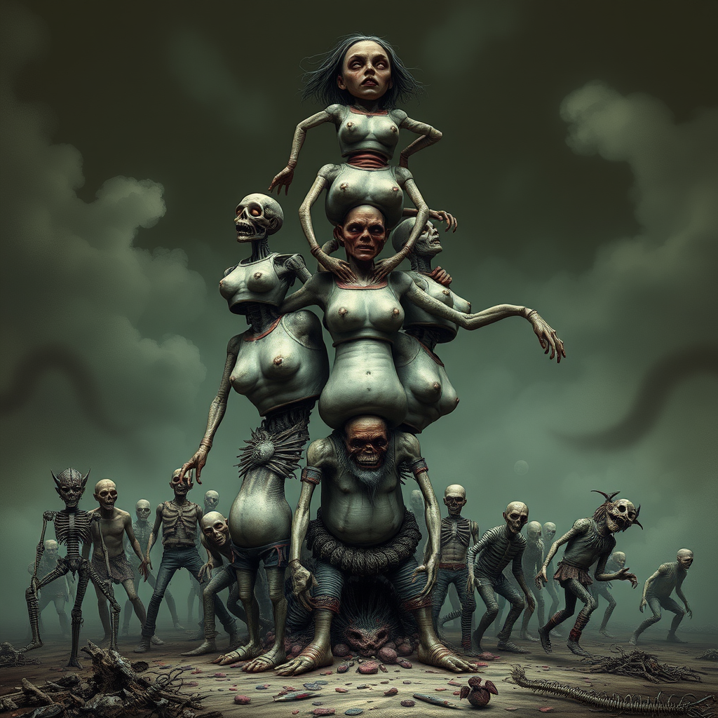 Alice in Zombieland by Tim Burton, distorted figures, stacked torsos like a grotesque totem pole, clumsy anatomy, surreal and unsettling forms, extra and missing limbs, floating disjointed parts, bizarre mutations, hauntingly ugly and distorted, blurry contours, chaotic assembly, where horror meets wonder in a twisted landscape of macabre imagination.