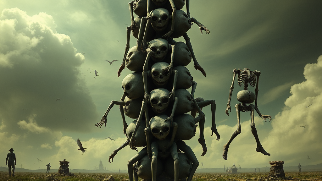 Alice in Zombieland by Tim Burton, surreal landscape, morbid totem of stacked torsos, distorted figures, misaligned anatomy, extra and missing limbs, floating appendages, disjointed and eerie limbs, bizarre mutations, unsettling, grotesque, hazy and blurred forms, echoes of amputation, otherworldly and distorted aesthetics, hauntingly abstract, nightmarish and uncanny visuals.