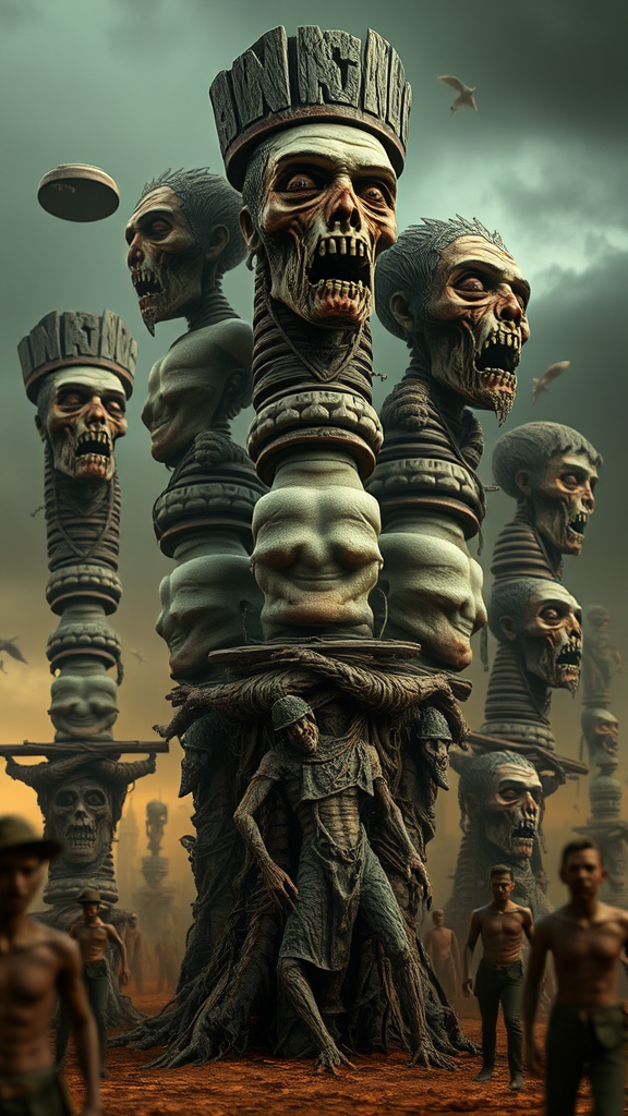 Alice in Zombieland by Tim Burton, twisted torsos form eerie totem poles, irregular anatomy with misplaced limbs, floating disjointed body parts, grotesque mutations and unsettling deformities, disturbingly ugly and nightmarish, blurred figures with hints of amputation, a surreal and chaotic landscape that blends horror with a fantastical twist.