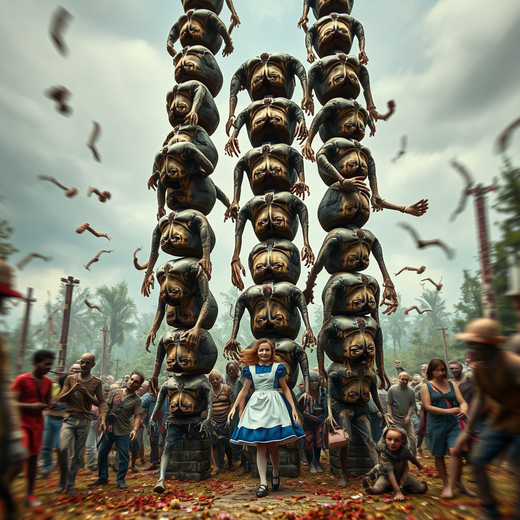 Alice in Zombieland, directed by Tim Burton, features a twisted landscape filled with grotesque imagery where stacked torsos form eerie totem poles. Distorted anatomies abound with poorly drawn figures, showcasing wrong proportions, extra limbs, missing appendages, and floating body parts. These disconnected limbs evoke a sense of mutation, creating a world both ugly and fascinatingly disgusting. Blurry visuals enhance the unsettling atmosphere, with scenes of amputation and bizarre transformations. In a psychedelic nightmare, Alice navigates this bizarre realm, confronting mutated creatures and facing the haunting beauty of disarray.