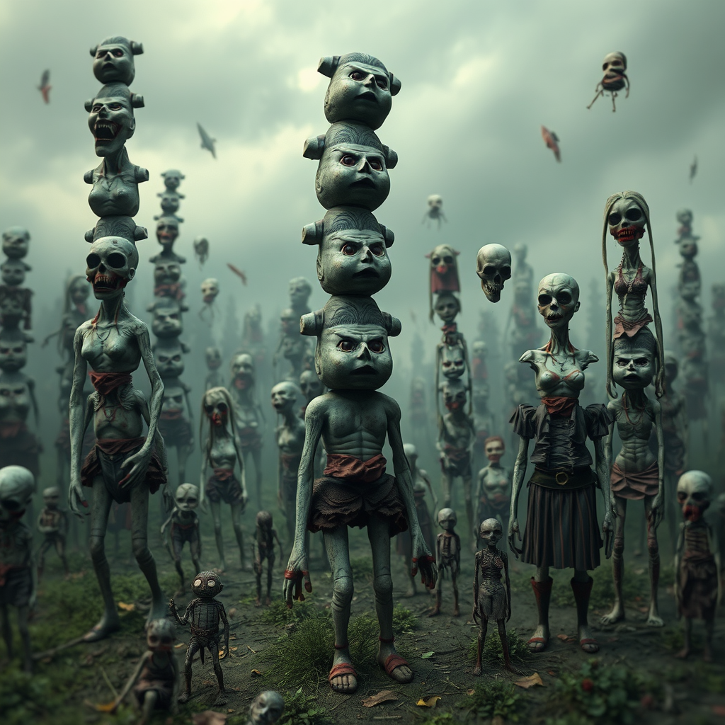 Alice in Zombieland, envisioned by Tim Burton, a surreal nightmare world of stacked torsos forming eerie totem poles, haphazardly drawn figures with distorted anatomy, featuring misplaced limbs and grotesque amputations. Disconnected body parts float aimlessly, a cacophony of mutation and eerie transformation. The landscape is a blurry tableau of unsettling sights, where beauty is twisted into the ugly and bizarre, creating a haunting, dreamlike vision of chaos and confusion.