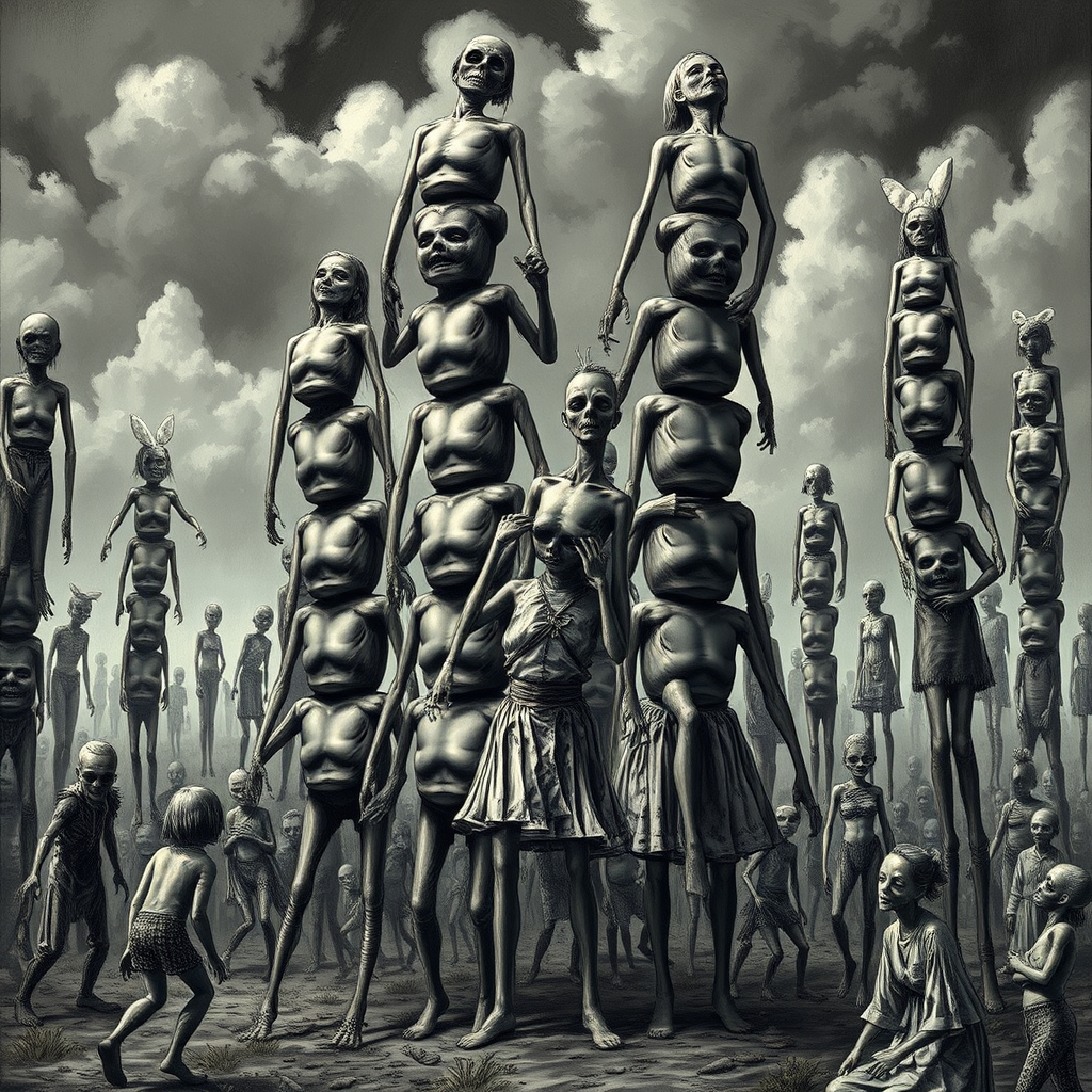 Alice in Zombieland, reimagined by Tim Burton, featuring a twisted landscape of stacked torsos resembling totem poles, exhibiting poorly drawn anatomy with wrong proportions. Mutated figures with extra and missing limbs, floating and disconnected in a grotesque dance. The scene is a cacophony of mutations, blending ugly beauty and spine-chilling disgust, where blurry visions of amputation reveal twisted narratives. Figures are in a surreal blend of chaos, hauntingly captivating yet malformed, echoing a darkly imaginative world.
