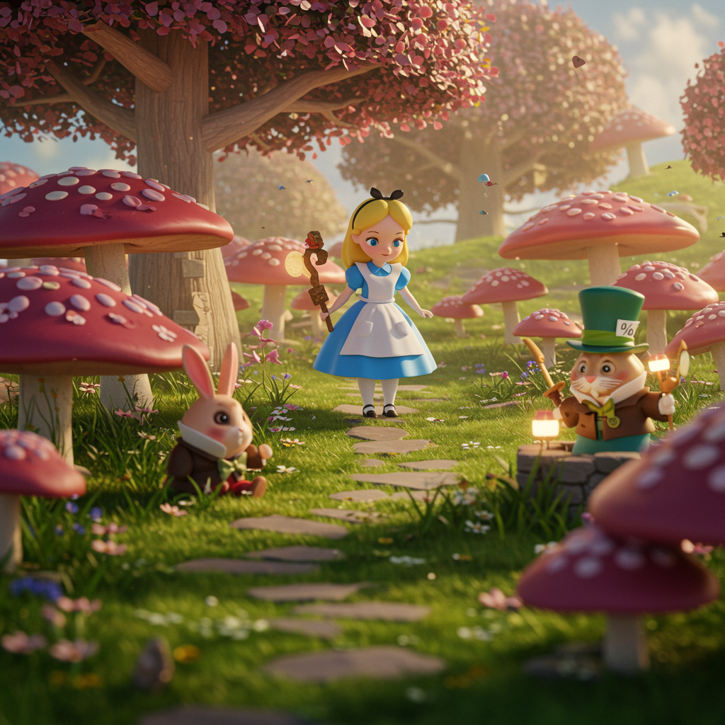 Alice in Wonderland-themed magical fairy tale realm, featuring a whimsical 3D landscape created using Unreal Engine and Octane Render. Enchanting characters and elements exemplify cuteness, captured in vibrant detail through 3D rendering techniques and enhanced with Adobe Photoshop to evoke a sense of awe and wonder. The scene is beautifully crafted, showcasing a timeless fantasy world where imagination reigns supreme and every corner is filled with delightful surprises.