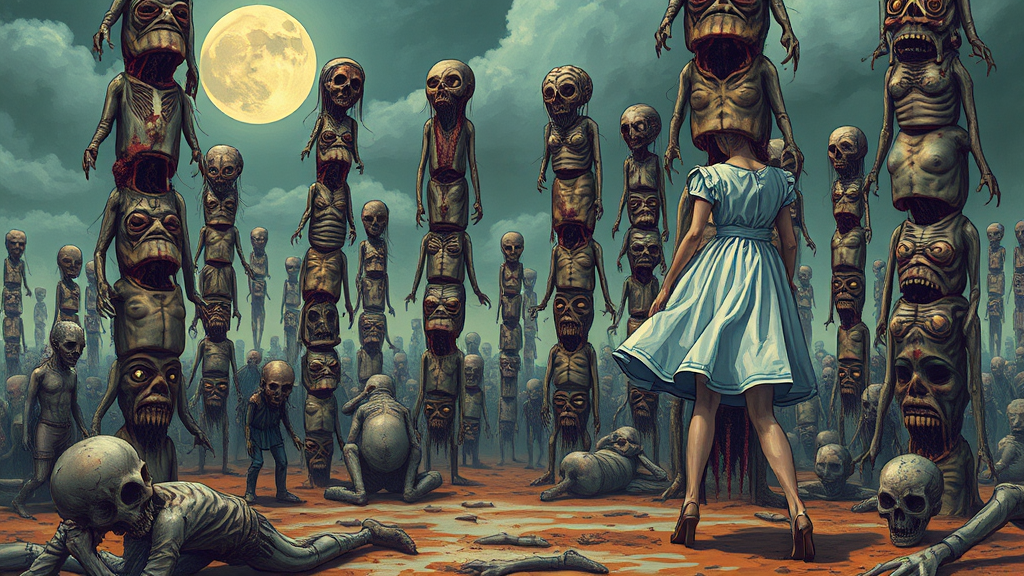 Alice wandering through a grotesque zombieland, a surreal Tim Burton-esque world of stacked torsos forming eerie totem poles, characterized by poorly drawn and distorted anatomical features. This twisted landscape is filled with bizarre mutations: extra limbs protrude unexpectedly, some limbs float disconnected, while others are completely absent. The scenery is unsettling, with a mix of ugly, misshapen forms and blurry, nightmarish figures stumbling through this haunting realm. Mutations and amputations abound, creating an unsettling tableau of the bizarre and the surreal.