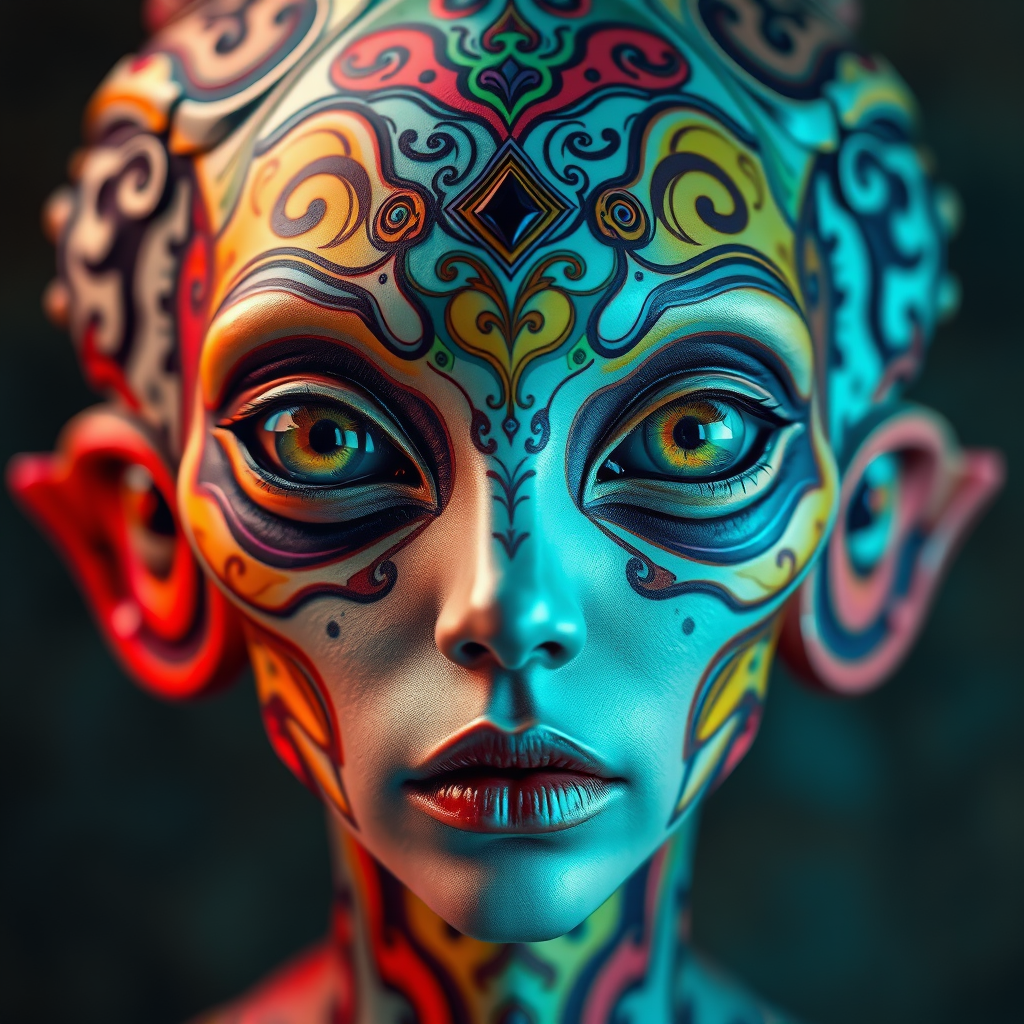 Alien artistry with balanced symmetry and intricate facial details, featuring meticulous portraiture and complex, vibrant patterns. Colorful and surreal, with sharp focus and a set background. Exhibiting incredible fine details, the composition is stunningly coherent and cinematic. Unique and epic, the artwork boasts great artistic elegance with perfect lighting. Delicate, highly elaborate, and vibrant in color, the ambient atmosphere is rich and deep, inspiring with a touch of otherworldly elegance.