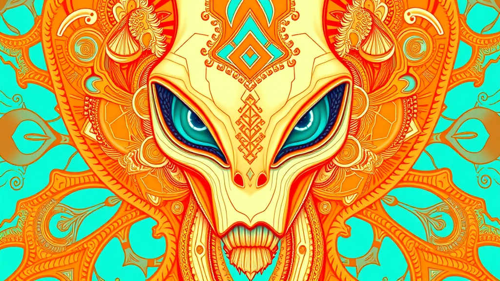 Alien artwork featuring symmetrical design, predominantly light orange and cyan hues, showcasing intricately detailed facial features. The portrait exudes an air of meticulous craftsmanship, with complex and elaborate patterns woven throughout the composition. The balanced symmetry highlights the alien's unique features, blending organic forms with geometric precision.