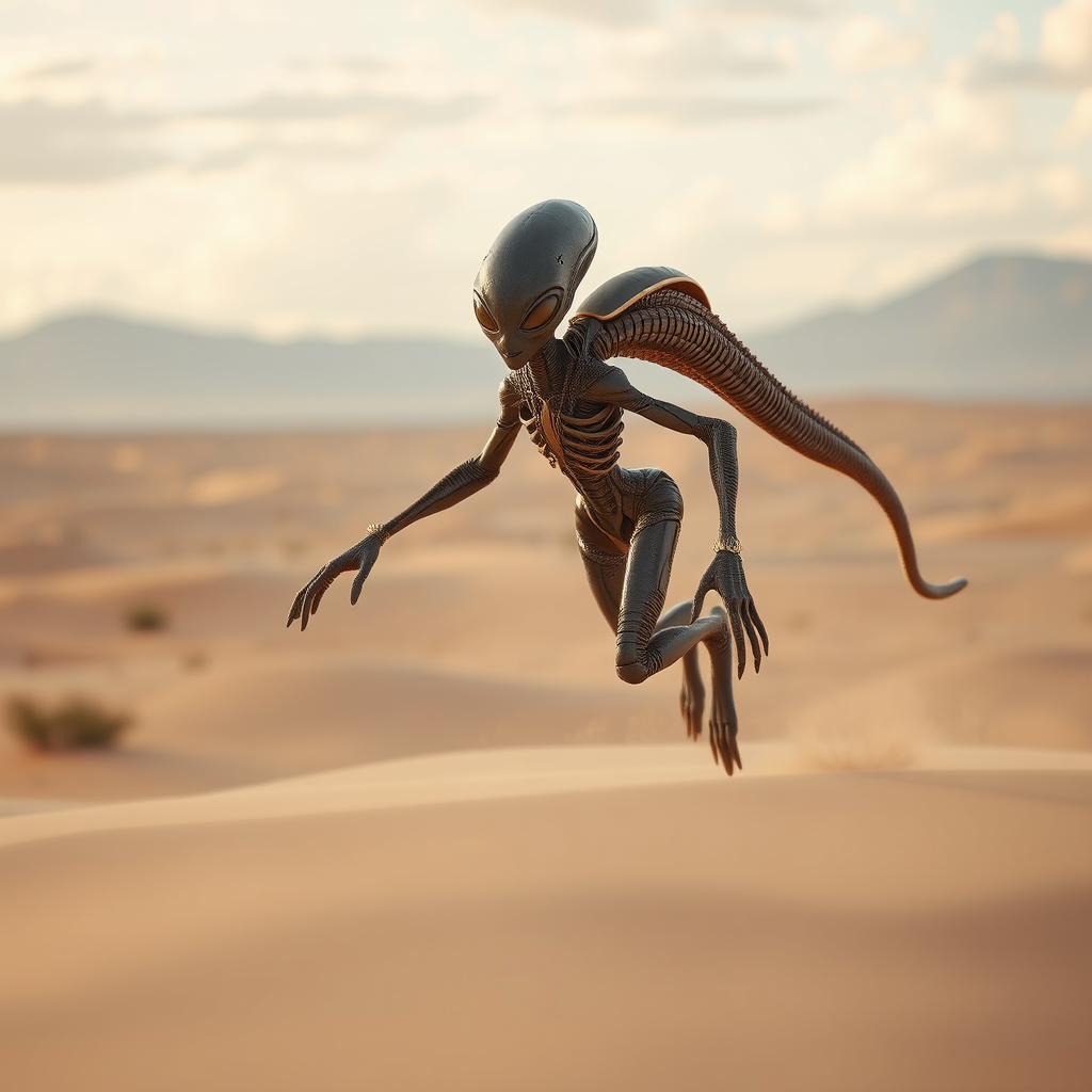 Alien being roaming a vast desert landscape, rendered in high definition, featuring a fusion of futuristic glamour. The creature is adorned in dark beige and shimmering gold tones, set against an airy background with expansive, dreamy skies. Its poses are surreal and fluid, embodying the essence of solarpunk aesthetics. The overall composition employs a low depth of field to enhance its otherworldly allure and captivate the viewer.