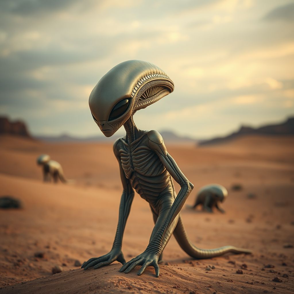 Alien being set amidst a desert landscape, depicted in futuristic glamour, blending dark beige and gold hues, captured with a low depth of field. This creature embodies solarpunk vibes with surreal poses under vast, expansive skies, exuding an intriguing presence. The scene is marked by a captivating aura, infused with slight luminescent touches and hints of otherworldly elegance.